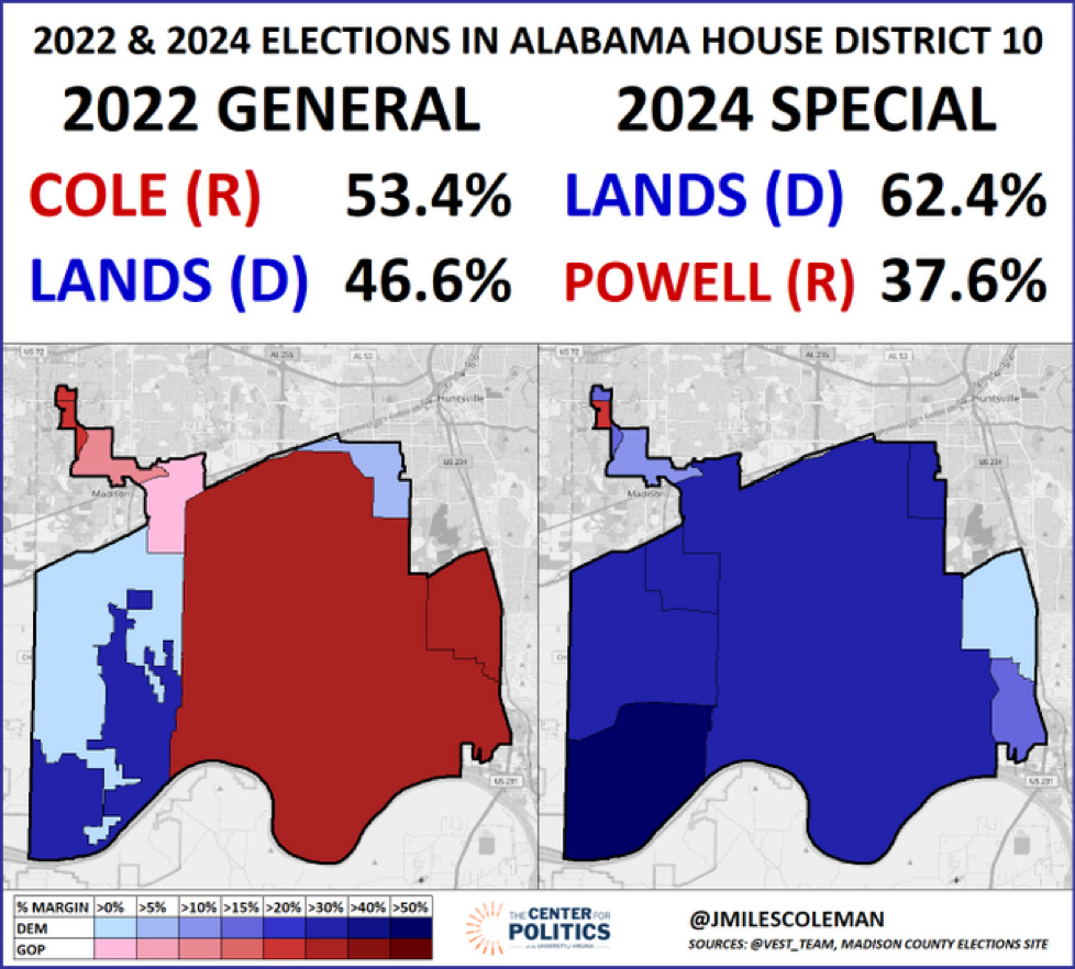 For Lands to pull off a 25 point win is indeed a seismic shift—a move of 32 points since 2022. You can see how striking the shift and the victory was by looking at the district map, provided by the Center for Politics. Since the last time she ran two years ago, Lands has picked up 16 points and the Republican fell by the same amount. Even most of the gerrymandered sliver in the northwest went blue.