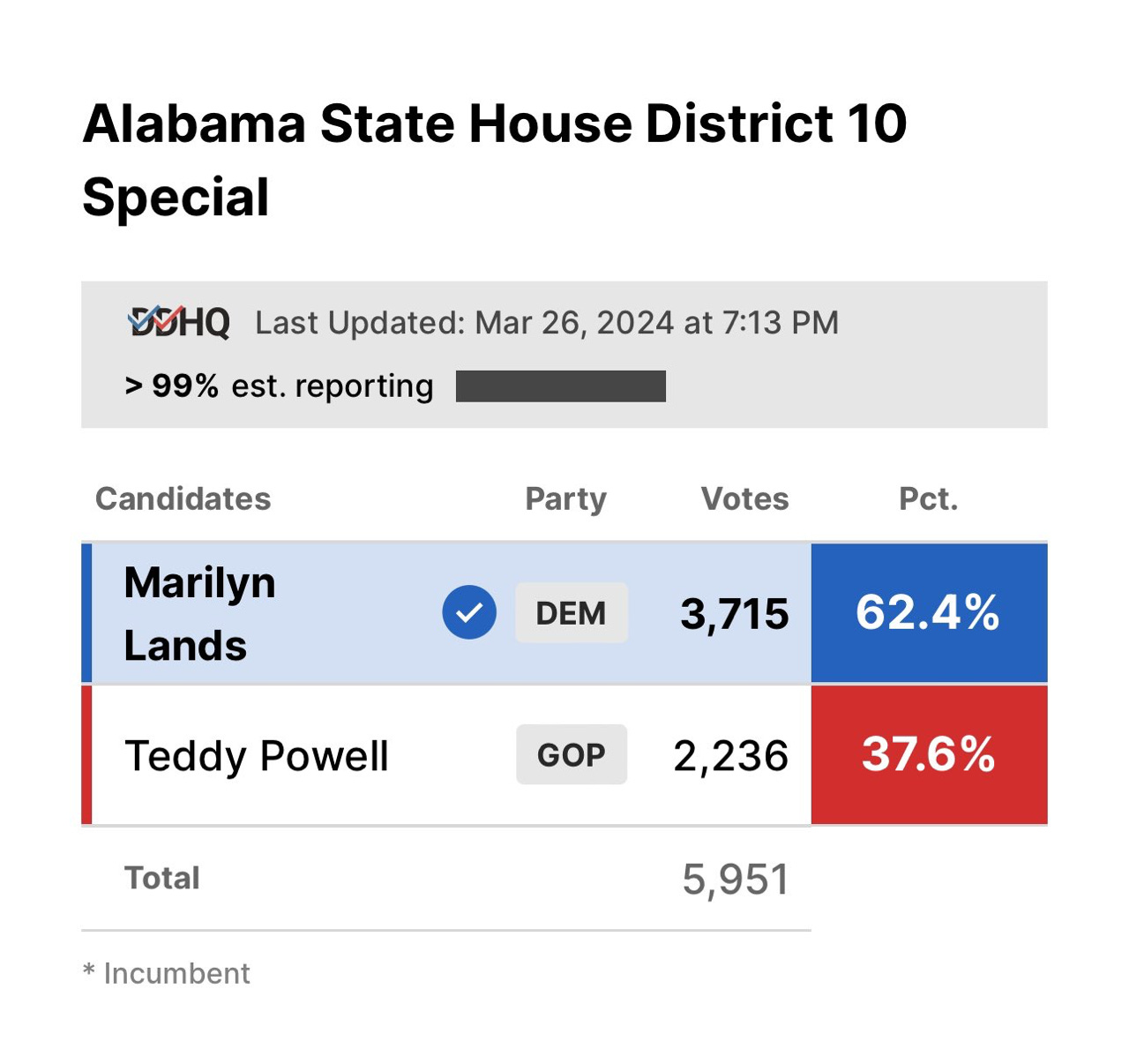 Echoing Lands’s words, DLCC Communications Director Abhi Rahman observed that “all eyes should be on Alabama right now.” Rahman added, “Last month’s IVF ruling in Alabama was a political earthquake that reverberated across the country, but the political consequences of that decision have yet to be tested. That’s where today’s election comes in.”