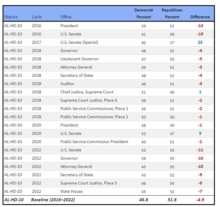 AL-10 has gone for the Republican candidate in most elections, and when a Democrat has managed to win it, it hasn’t been by much. The only big exception was when Doug Jones was running for Senate in 2017 against a known child molester, Roy Moore. Here’s the history of how elections have gone in that district, and you’ll see it’s pretty strongly red.