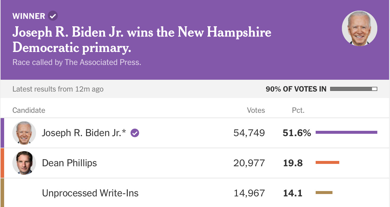 Meanwhile, Joe Biden didn’t even campaign in New Hampshire because its early primary was unsanctioned by the party. But through a grassroots effort, Biden still managed to defeat his nearest opponent through a write-in campaign. They’re still counting ballots, but it appears Biden won by over 40 percent, and his name wasn’t even on the ballot.