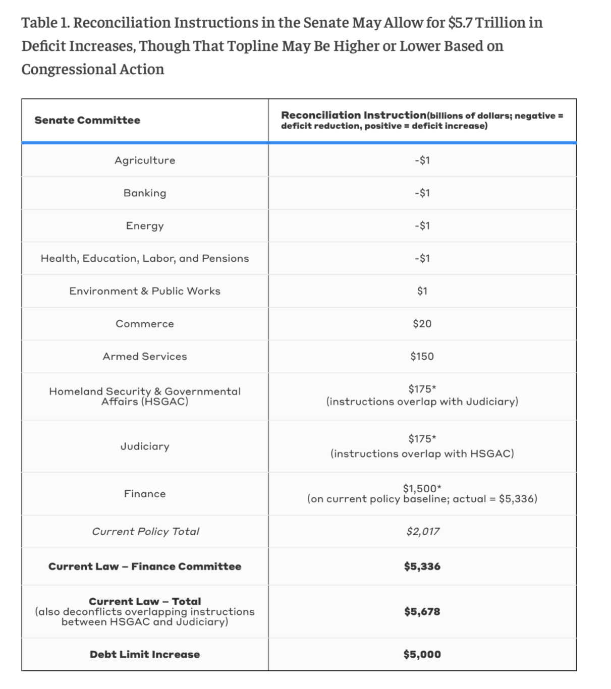 Below are the top line numbers for the Senate’s reconciliation instructions to its committees, put together by the Bipartisan Policy Center. You’ll see that the Senate has earmarked almost no money to be cut in this version, while increases in expenditures are mighty large, requiring a debt limit increase of $5 trillion to pay for extending the Trump tax breaks for the wealthy.