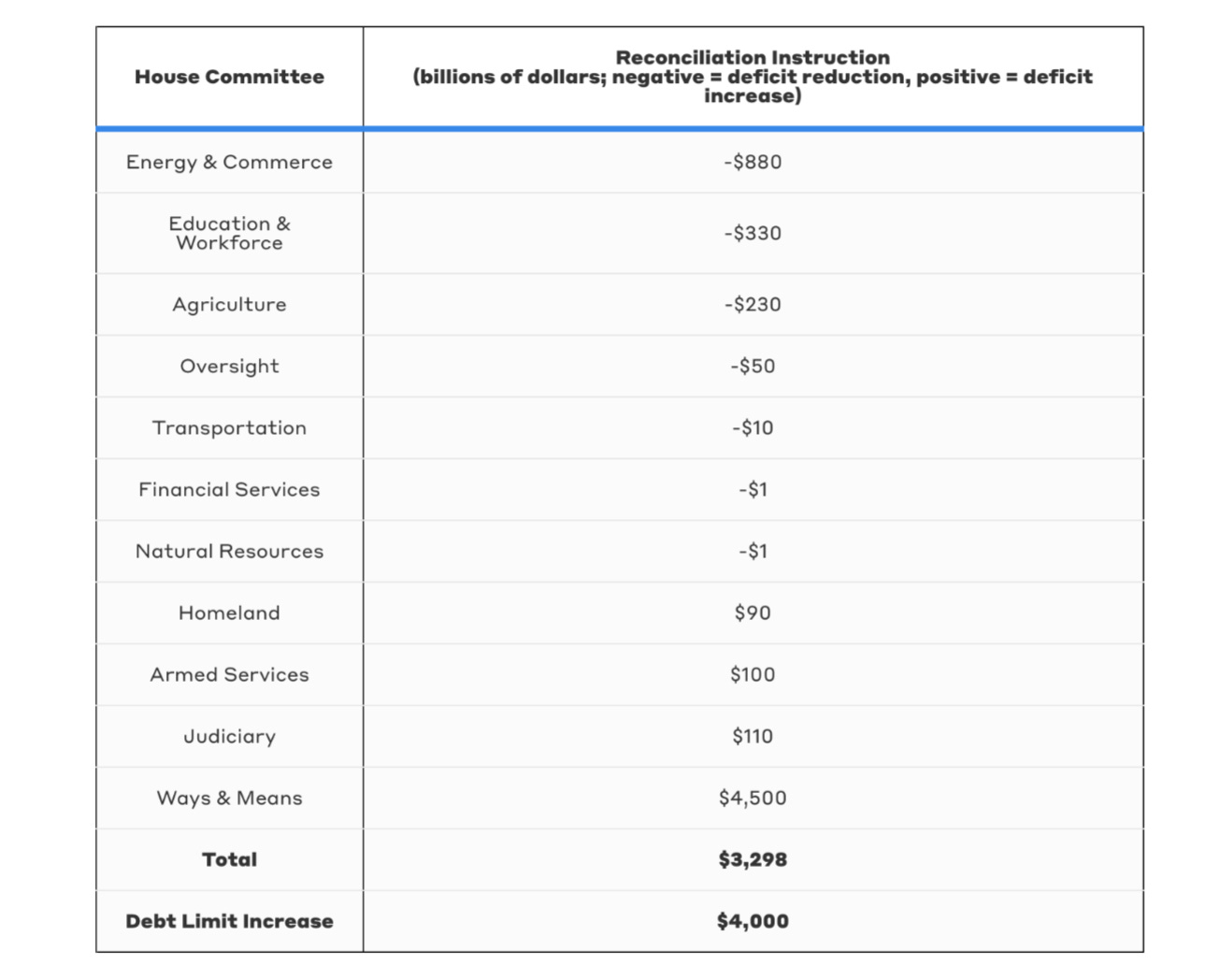 Compare those top line numbers to the House version below, which enumerates gigantic cuts to Medicaid (under Energy and Commerce), Education and Agriculture. These collectively create a $1 trillion smaller debt increase, but it’s still $4 trillion.