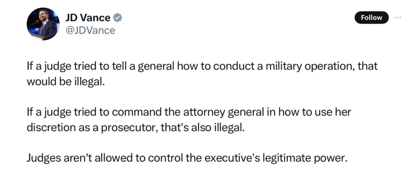 MAGA leaders’ reactions to Judge Nichols’s and Judge Engelmayer’s orders were telling. JD Vance, who went to Yale Law School and absolutely knows what he is doing, tweeted that the judges’ rulings were “illegal” and that judges “aren’t allowed to control the executive’s “legitimate power.”