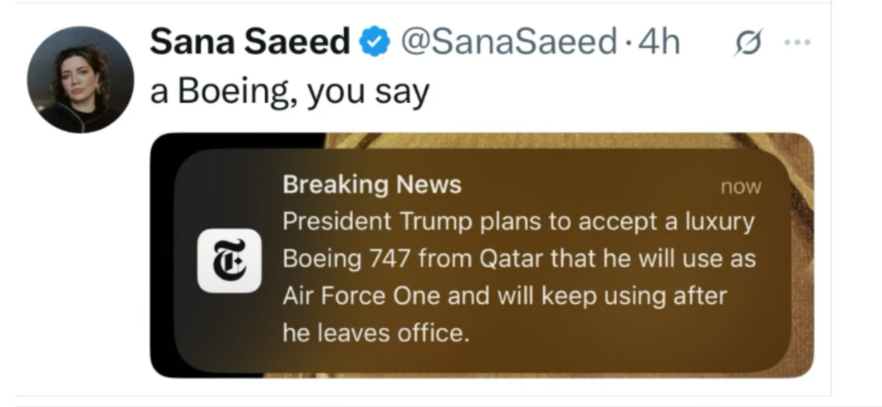 ABC News reported over the weekend that Trump was preparing to accept a plane worth $400 million from Qatar. As the new Air Force One, it would be totally decked out, a “palace in the sky,” as it were. And Trump would get to use it after his term as part of his “presidential library.”