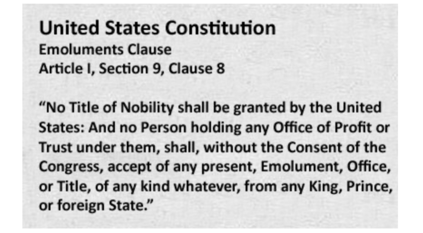 First, the Constitution expressly prohibits the President from accepting “any present, emolument, Office or Title” from any “foreign state” without approval from Congress.