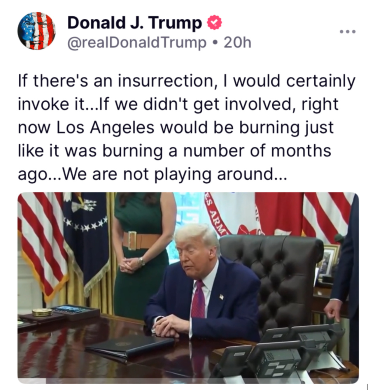 It’s to the White House’s advantage to label protests as insurrections, of course, because it dilutes the power and imagery of the actual insurrection within a history the GOP is eager to rewrite. The presence of “insurrectionists” in Los Angeles would also open the door to invocation of the Insurrection Act, just as Trump recently declared while speaking to the press:
