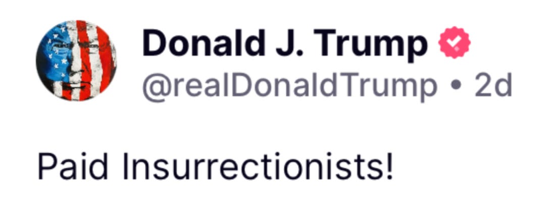 It wasn’t long before Trump began to parrot Miller’s characterization. Two days ago, for example, on his Truth Social platform, he called the protestors “paid insurrectionists.”