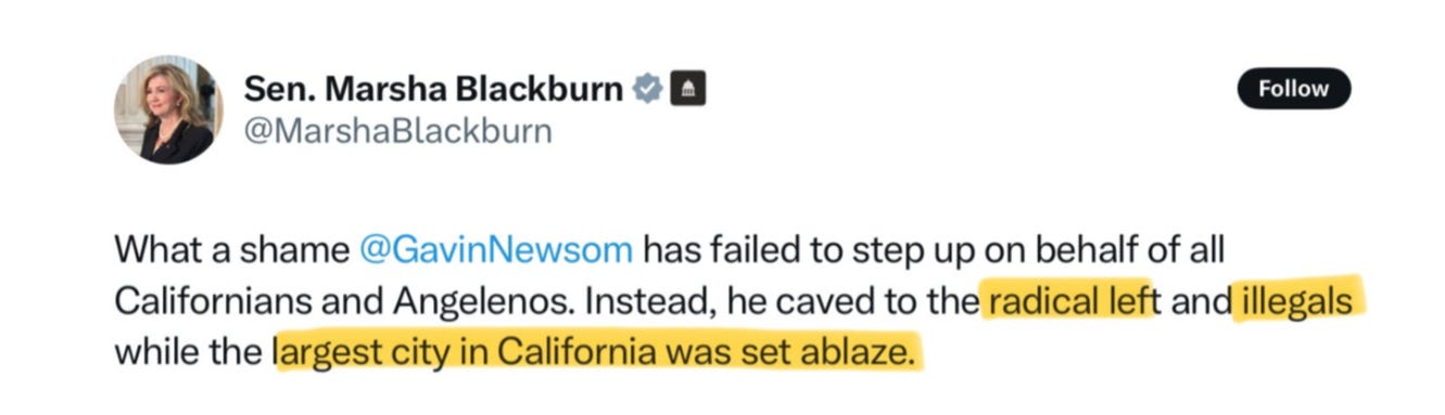 This has two effects. First, it gives the distinct impression that there is massive danger, chaos and destruction happening. Second, it suggests, falsely, that the entire city of Los Angeles looks this way. From this, we wind up with tweets from Republican senators like Marsha Blackburn of Tennessee, who claimed Gov. Newsom caved to the “radical left” and “illegals” while the “largest city of California was set ablaze.”