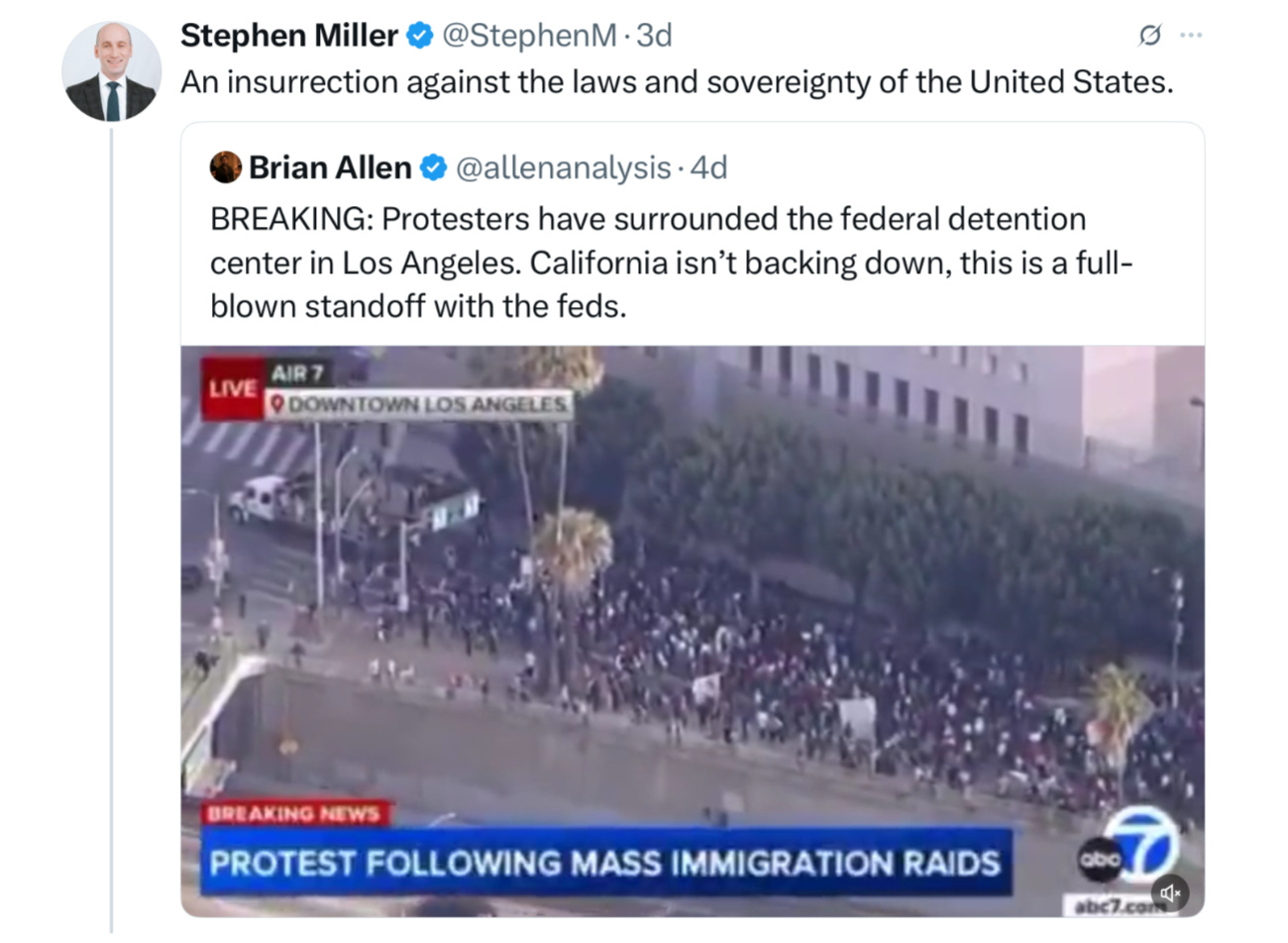 Suddenly, the anti-ICE protests of last weekend, which were by and large peaceful, were dubbed “insurrections” against the government—even when they were simply crowds of people protesting ICE abuses. Here was Stephen Miller starting things down this path on Friday: