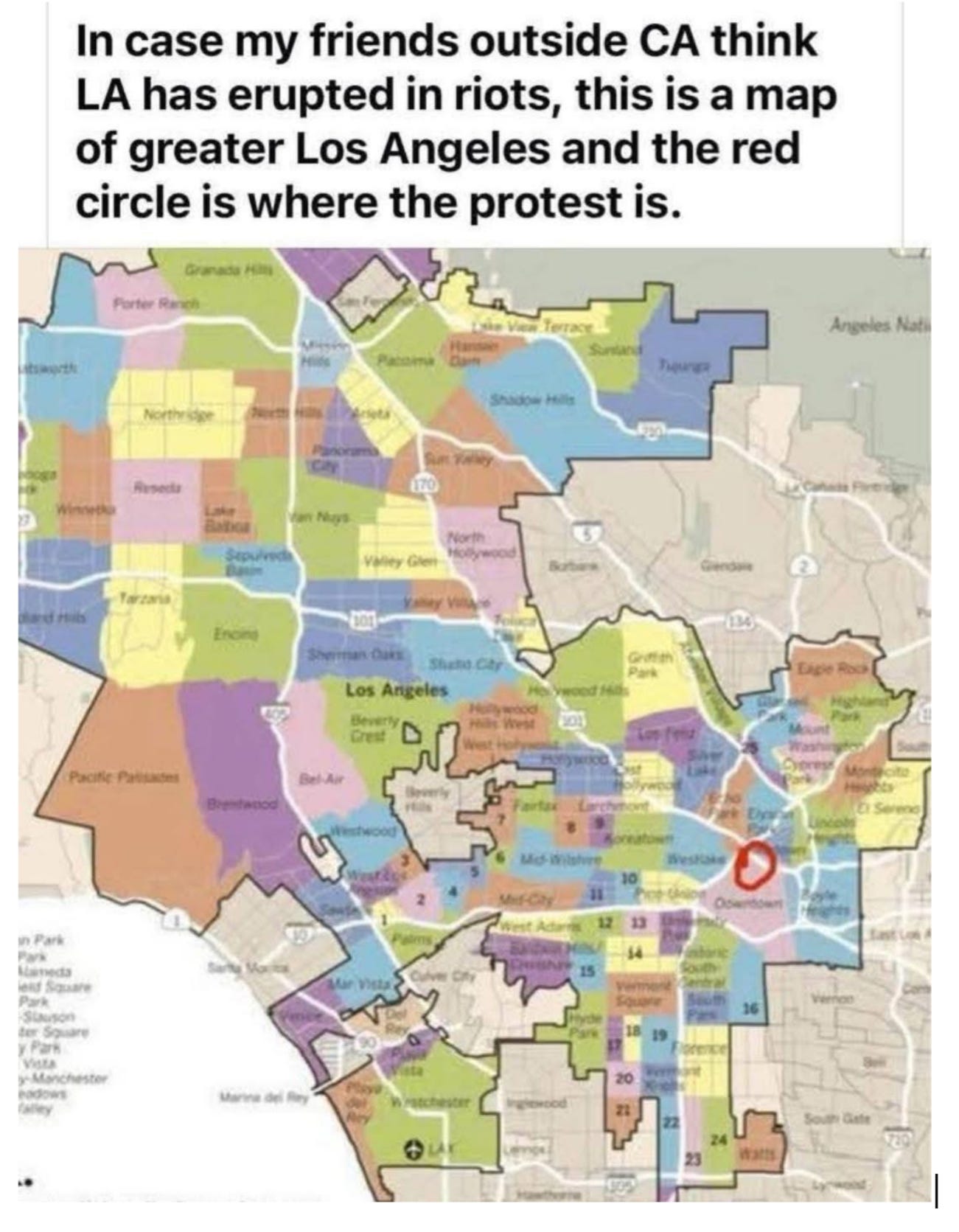 For some perspective, here is a map that I shared on social media from a friend’s post. It shows the entire city of L.A. with the small conflict zone circled .