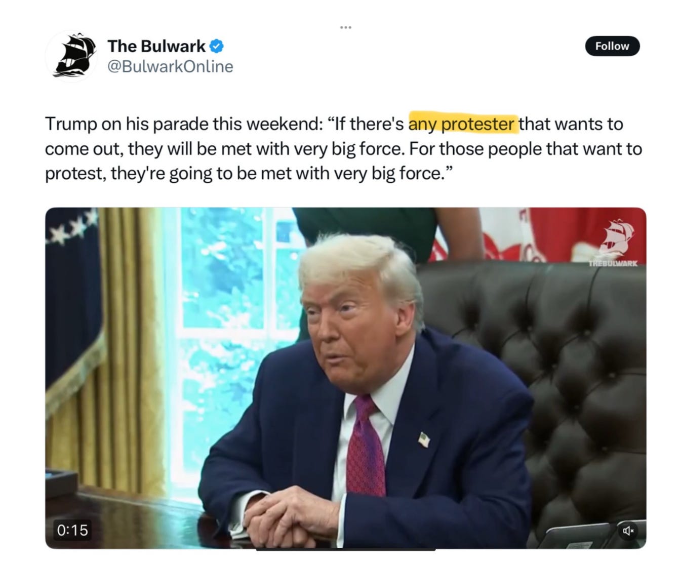 Trump also referred to the protests as “catastrophic Gavin Newscum inspired Riots going on in Los Angeles.” He then issued a threat to “any protester” of his army parade this weekend that they are going to be met with “very big force.”