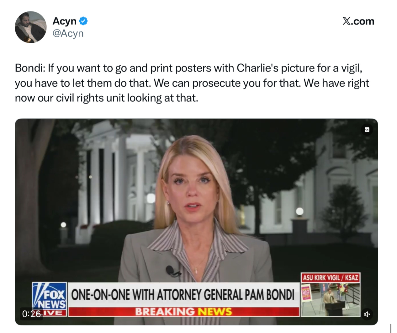 Right-wing commentator Savannah Hernandez called Bondi’s sentiment “destructive,” adding, “She needs to be removed as attorney general now.” Talk show host Dave Rubin similarly called for Bondi’s “immediate resignation,” describing her statement as an “unbelievably bad take.” Provocateur Mike Cernovich tweeted that the “hate speech” claim, paired with Bondi’s mishandling of the case of Jeffrey Epstein, shows that the attorney general “really isn’t ready for this moment.”