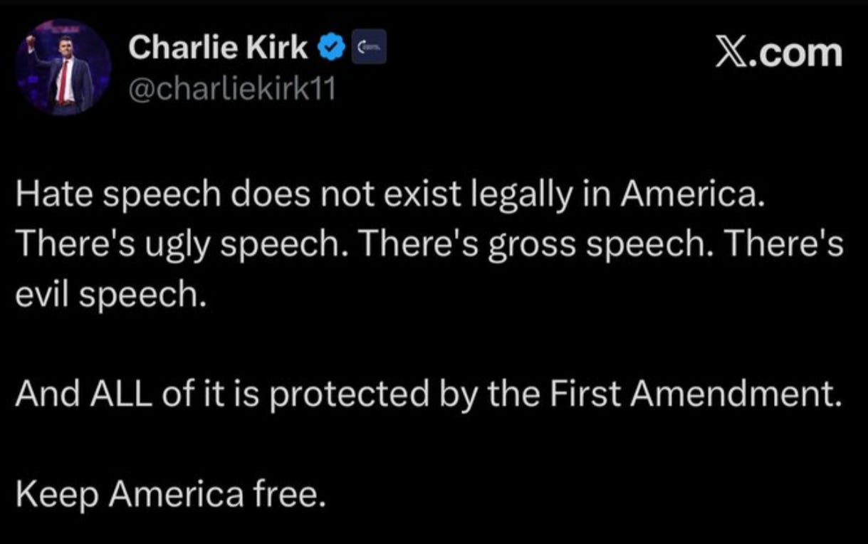 Even Charlie Kirk, whose reputation Bondi was trying to protect, would have taken issue with her. “Hate speech does not exist legally in America,” he tweeted in May of 2024.