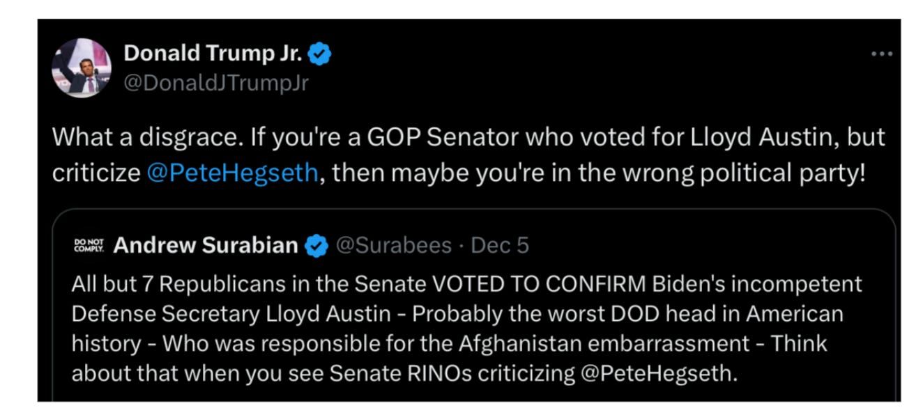 On social media, Don Trump Jr. tweeted, without naming names, that if “you’re a GOP Senator who voted for Lloyd Austin”—who was appointed by President Joe Biden—but are now criticizing Pete Hegseth, then “maybe you’re in the wrong political party!”