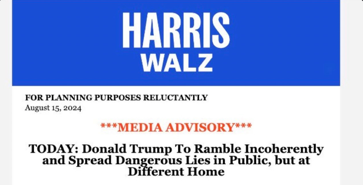 The Harris/Walz campaign said it best in describing Donald Trump’s latest announcement for yet another “press conference” to be held outside his Bedminster, NJ mansion. Harris/Walz advised the media, “TODAY: Donald Trump to Ramble Incoherently and Spread Dangerous Lies in Public, but at Different Home.”