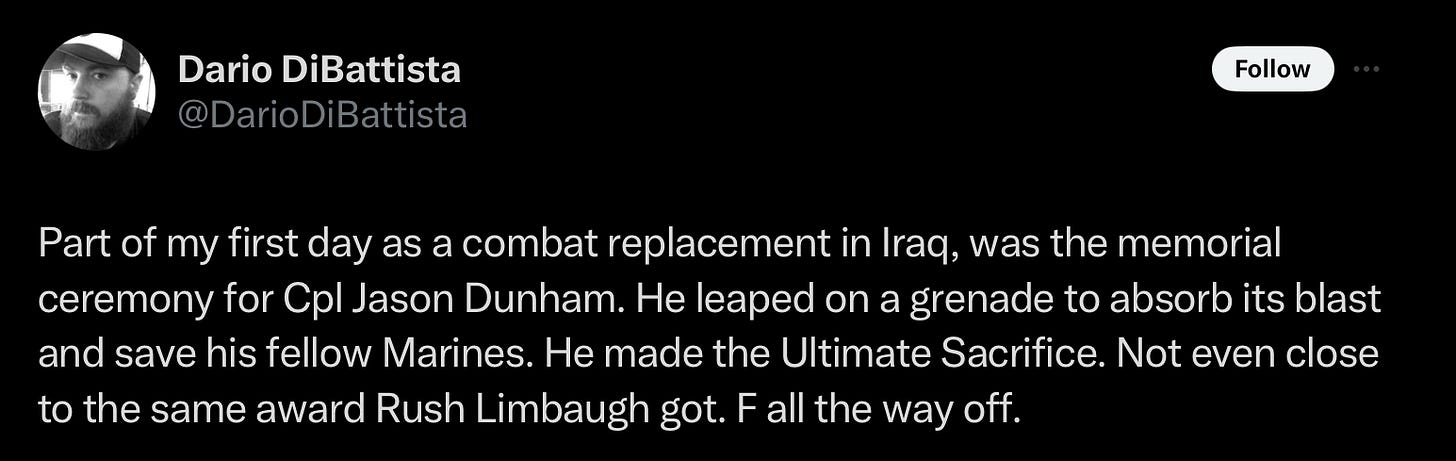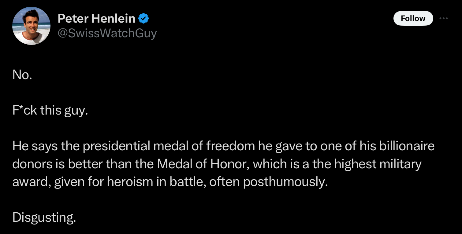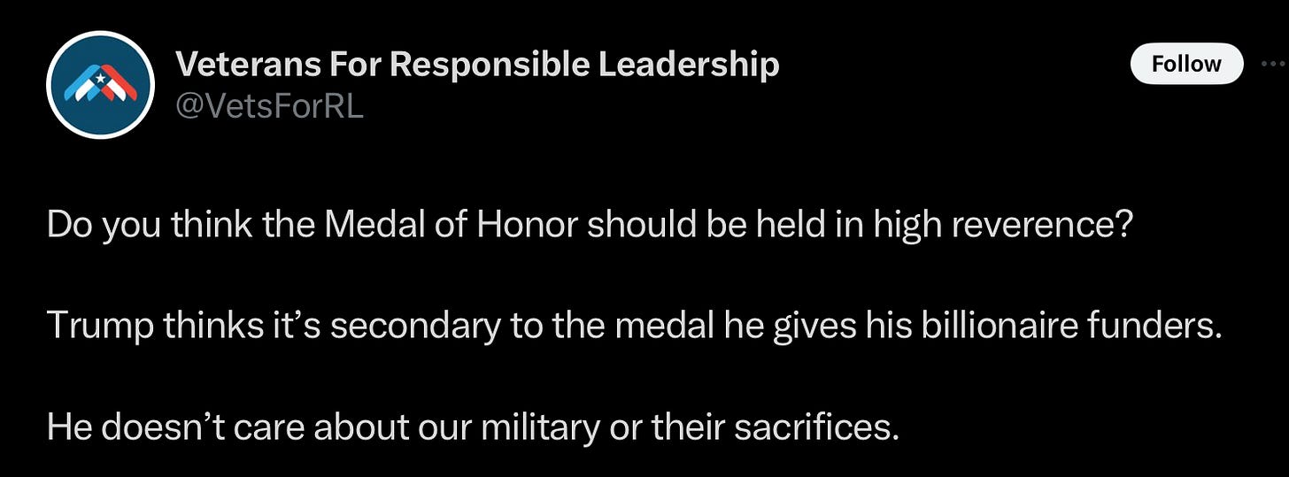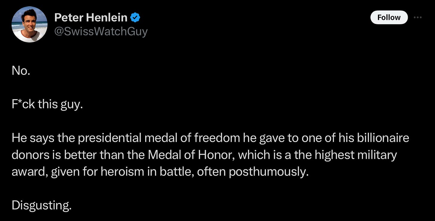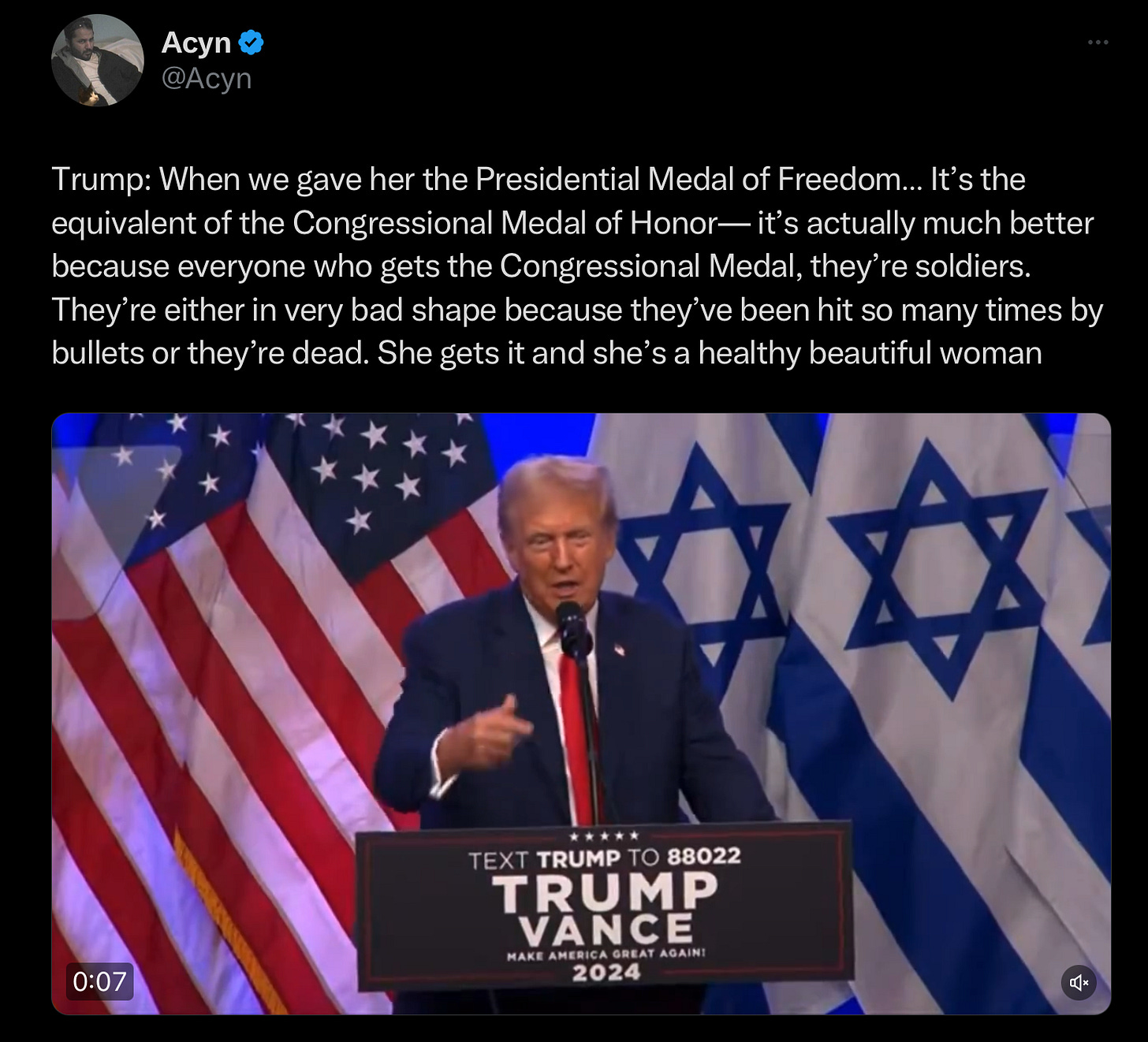 “But civilian version, it’s actually much better because everyone [who] gets the Congressional Medal of Honor, they’re soldiers. They’re either in very bad shape because they’ve been hit so many times by bullets or they’re dead,” Trump said, not understanding how poorly this would play. “She gets it, and she’s a healthy, beautiful woman, and they’re rated equal, but she got the Presidential Medal of Freedom, and she got it for—and that’s through committees and everything else.”