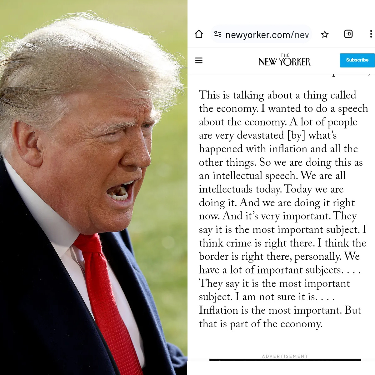 They were right to call this out. On Thursday, Trump had delivered a speech “on the economy” before supporters in Ashville, NC. Here’s an excerpt published by The New Yorker. And no, it’s not satire.