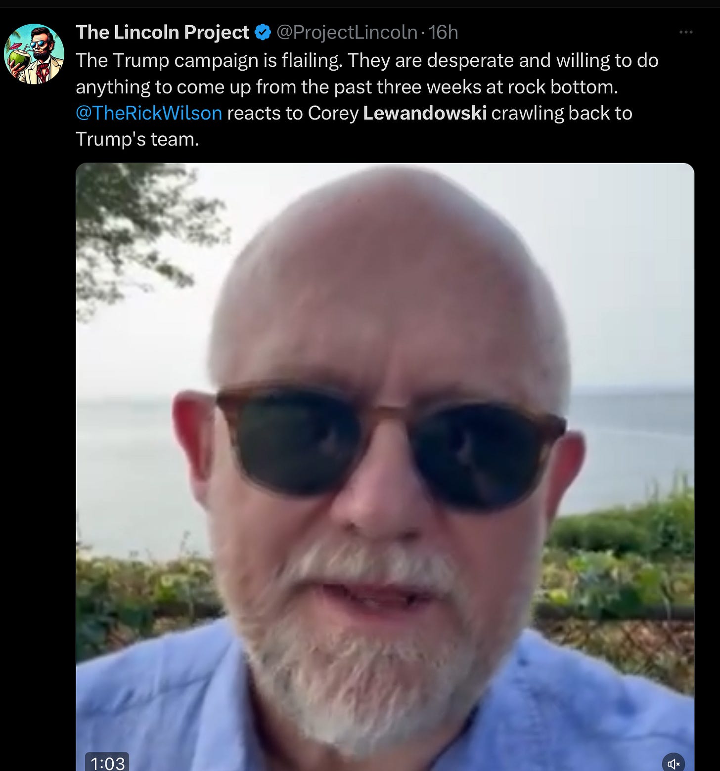 The addition of Lewandowski at this critical moment for the campaign has signaled to many that Trump himself believes it is floundering and wants to shake things up, perhaps by pushing out Susie Wiles and Chris LaCivita at the top of the campaign staff. Maybe he wants back that winning feeling from 2016 and plans to reassemble the old gang. The Lincoln Project’s Rick Wilson, a former GOP campaign consultant, had the most colorful take on this.