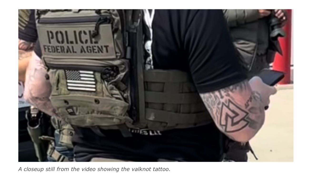 While ICE agents usually hide their faces, their tattoos are often visible to cameras. One federal agent in Martha’s Vineyard was spotted with the white nationalist “Valknot” tattoo on his arm, stoking fears among residents.