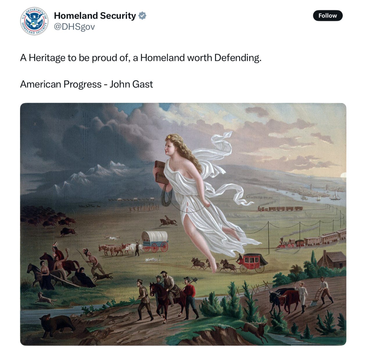 Lately, the iconography of DHS has grown increasingly and expressly Nazi and white nationalist. A recent post made a direct references to the racist idea of “manifest destiny” while using two capital Hs in the caption—something Prof. Heather Cox Richardson noted is a reference to the words Heil Hilter.