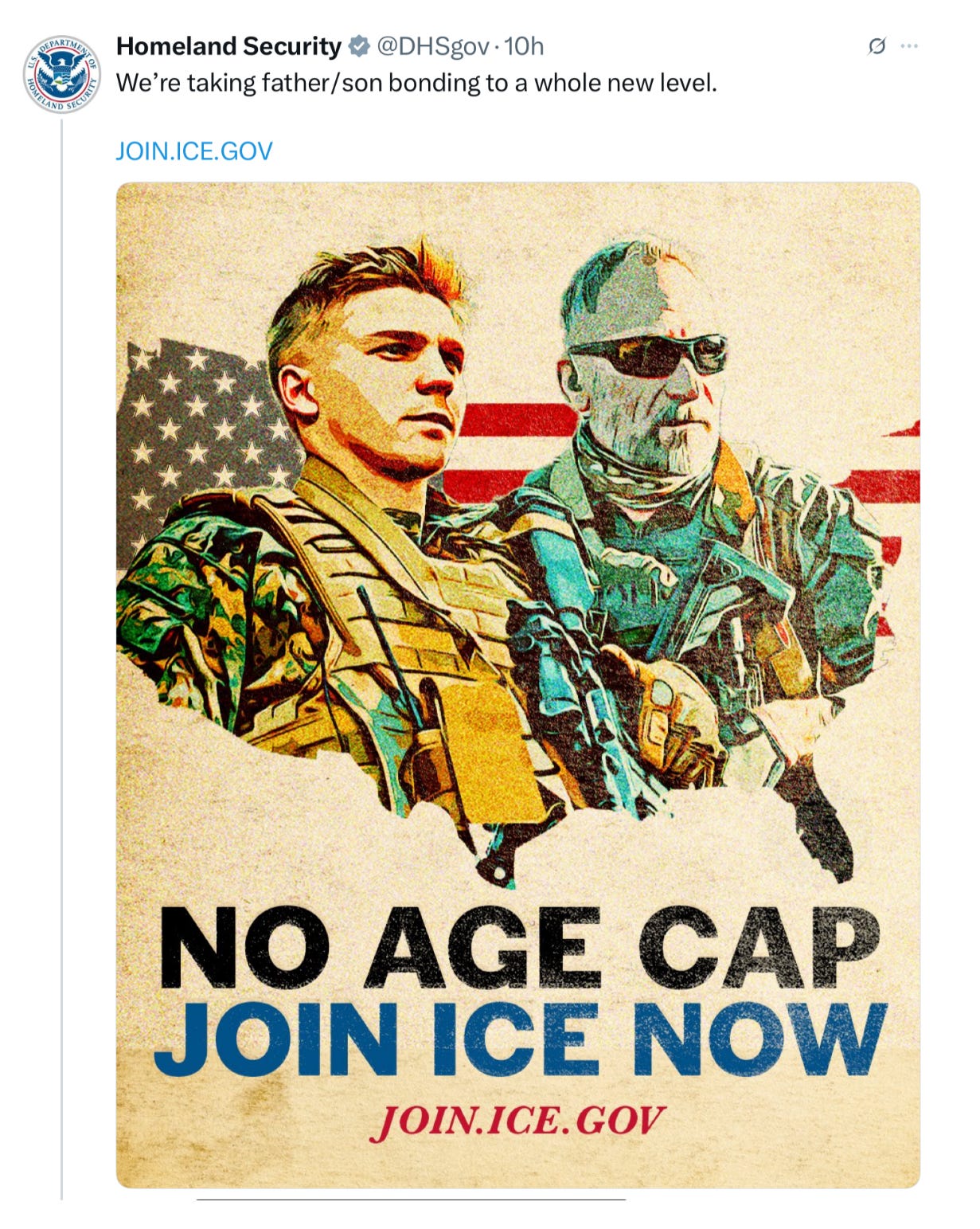 Sensing that the pool of available officers needs to be expanded, Homeland Security further announced on Wednesday that it was lifting the age caps on officers who can serve. It posted ads touting, “We’re taking father/son bonding to a whole new level” showing what appears to be an idealized version of an Aryan youth with his rugged father.