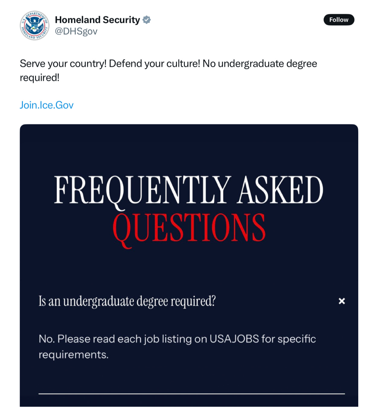To those who wonder if this is a stretch or dismiss it as mere artistic license, consider another recent post by DHS that expressly conflates its mission to control immigration and the border with defending the “culture” of this country—all while emphasizing “no undergraduate degree required!”