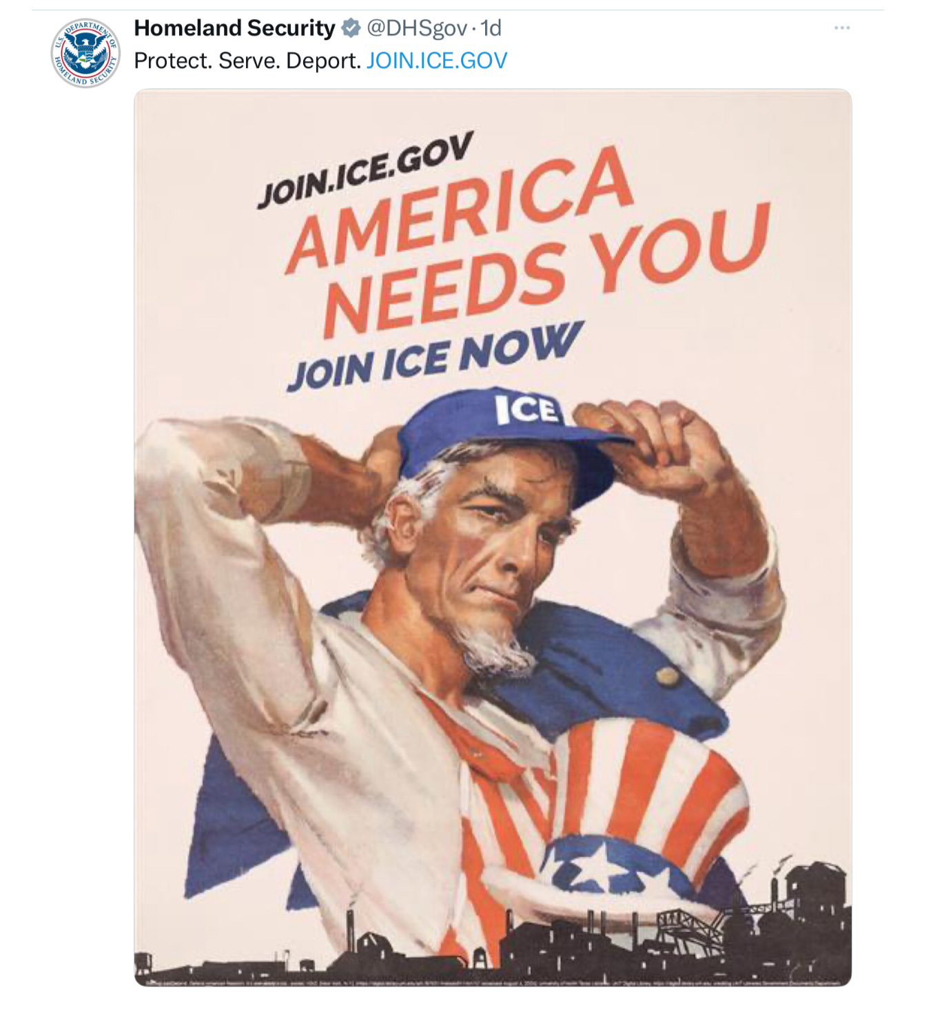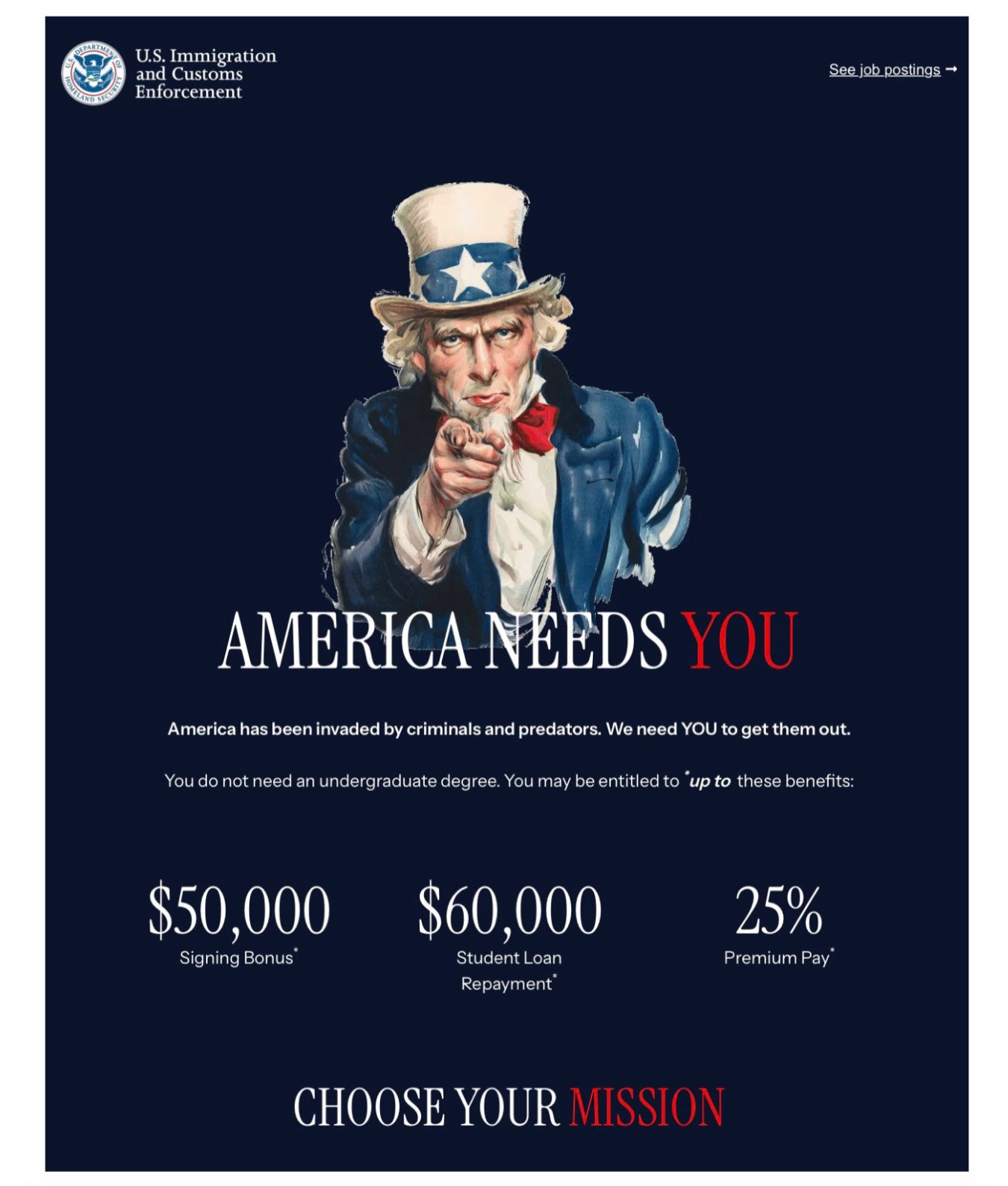 To promote this new program and these benefits, ICE ran online ads warning that “America has been invaded by criminals and predators,” with a World War II image of Uncle Sam saying “America Needs You” to “get them out.”