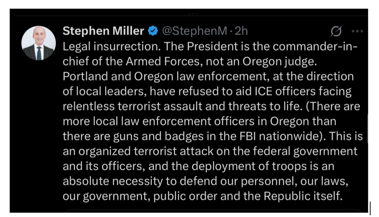 Miller called U.S. District Court Judge Karin Immergut’s temporary restraining order against deployment of federal troops to Portland a “legal insurrection.”