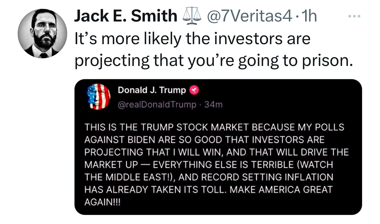 Later in the week, Trump decided to get mad over the record high stock markets and to find a way to take credit for them. Parody Jack Smith said no.