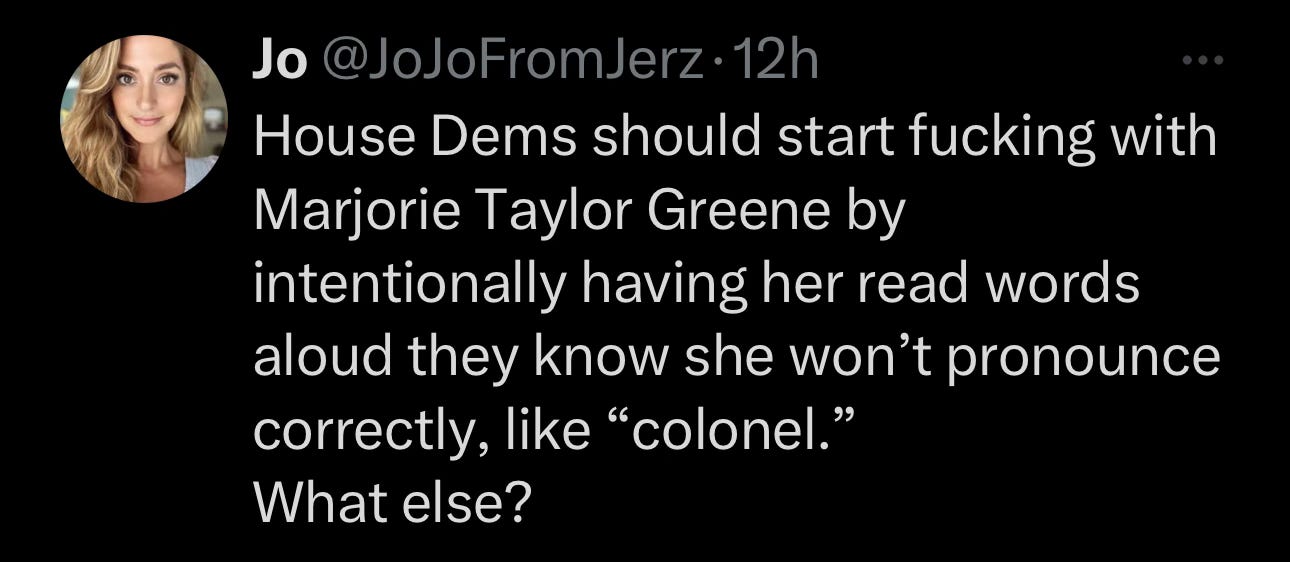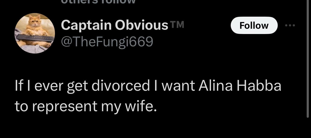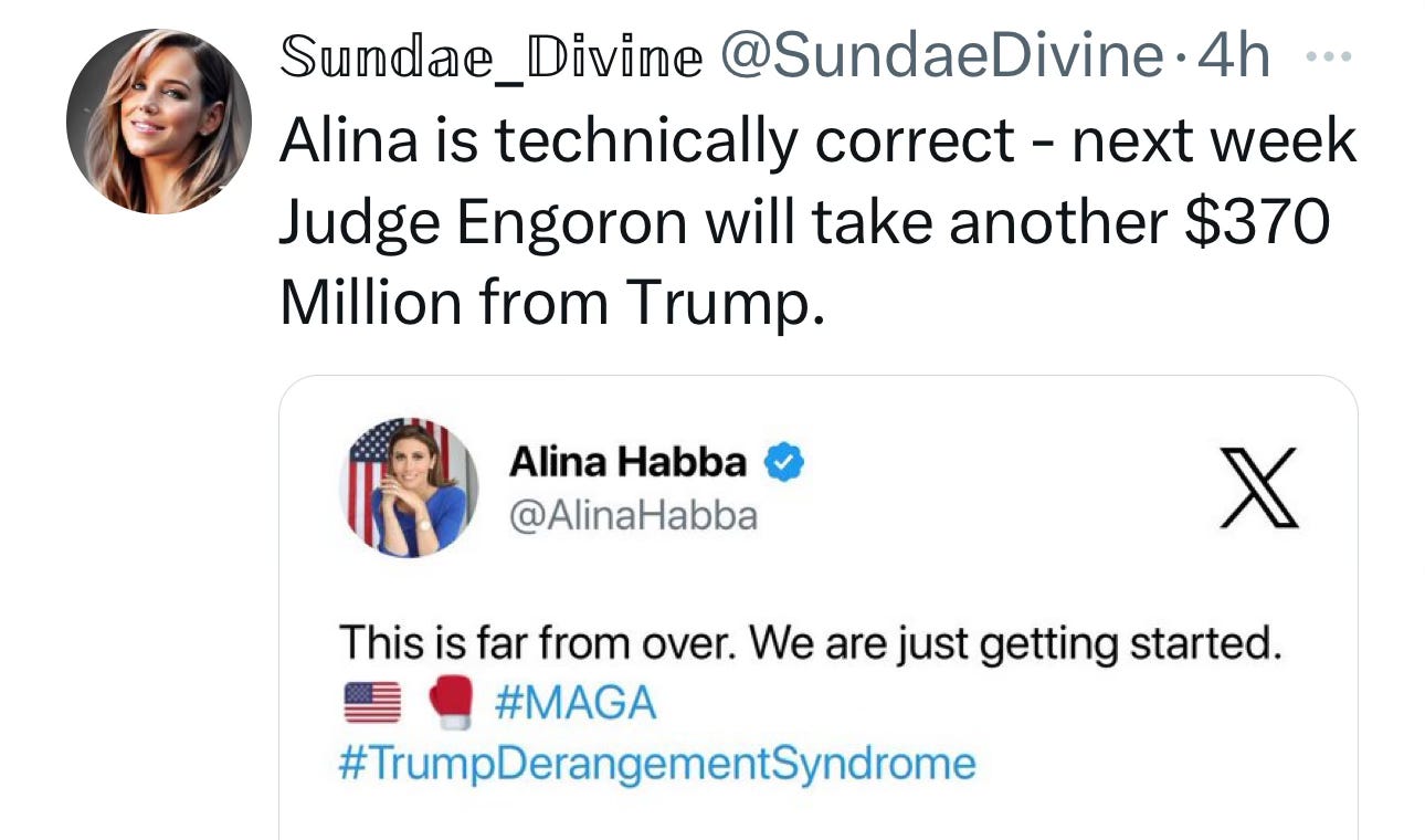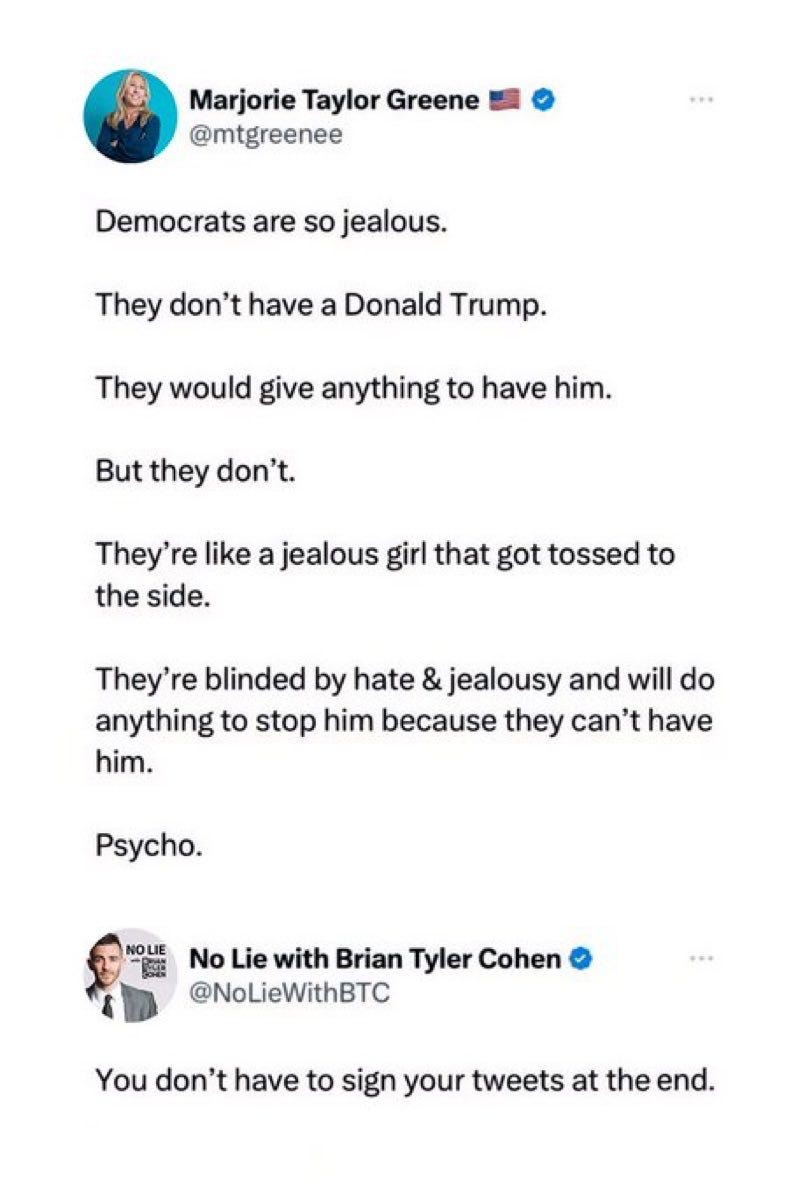 I just cant! 🤣 Whatta summary... I'll laugh all day. Is this really happening in America? We have to find the humor if we're going to survive. The Alina Habba series was OVER THE TOP! 😂 And does MTG have ANY shame? She surely has to know people are making fun of her...it's so damned easy! Make America Smart Again! Have a great weekend. ✌️💙