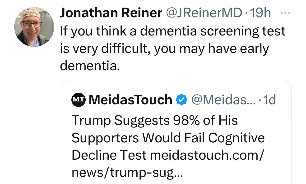 The sad thing is, many MAGA faithful will buy anything Trump’s selling. Take his claims that he passed dementia screening tests with flying colors … while nearly all his own supporters would not.