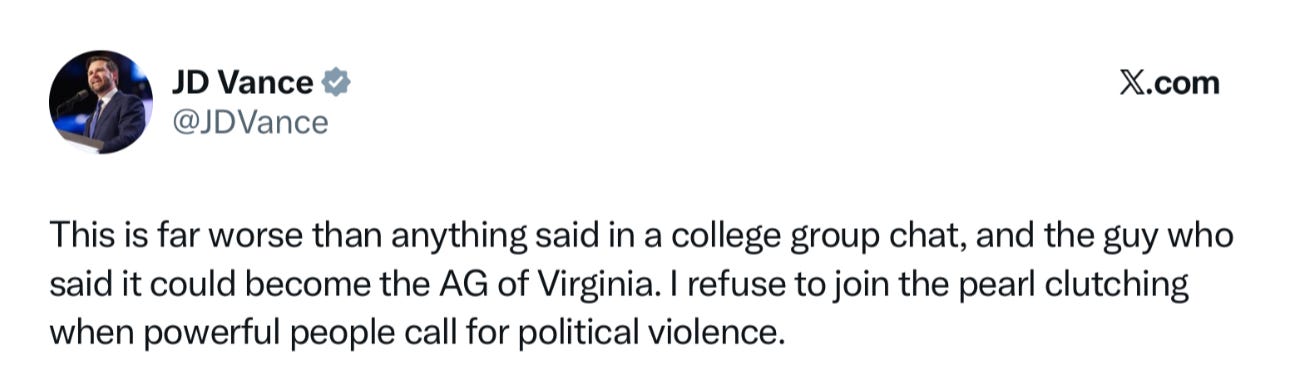 Vance brought up a leaked private text of the Democratic candidate for Attorney General of Virginia, Jay Jones, and called it “far worse” before brushing off the outrage over the Telegram channel as “pearl clutching” over a “college group chat.” For context, here is what he posted—and I’m sorry, this is not “far worse” than what I’ve described above and, though grotesque and cruel, was not a call for “political violence” as Vance claims.