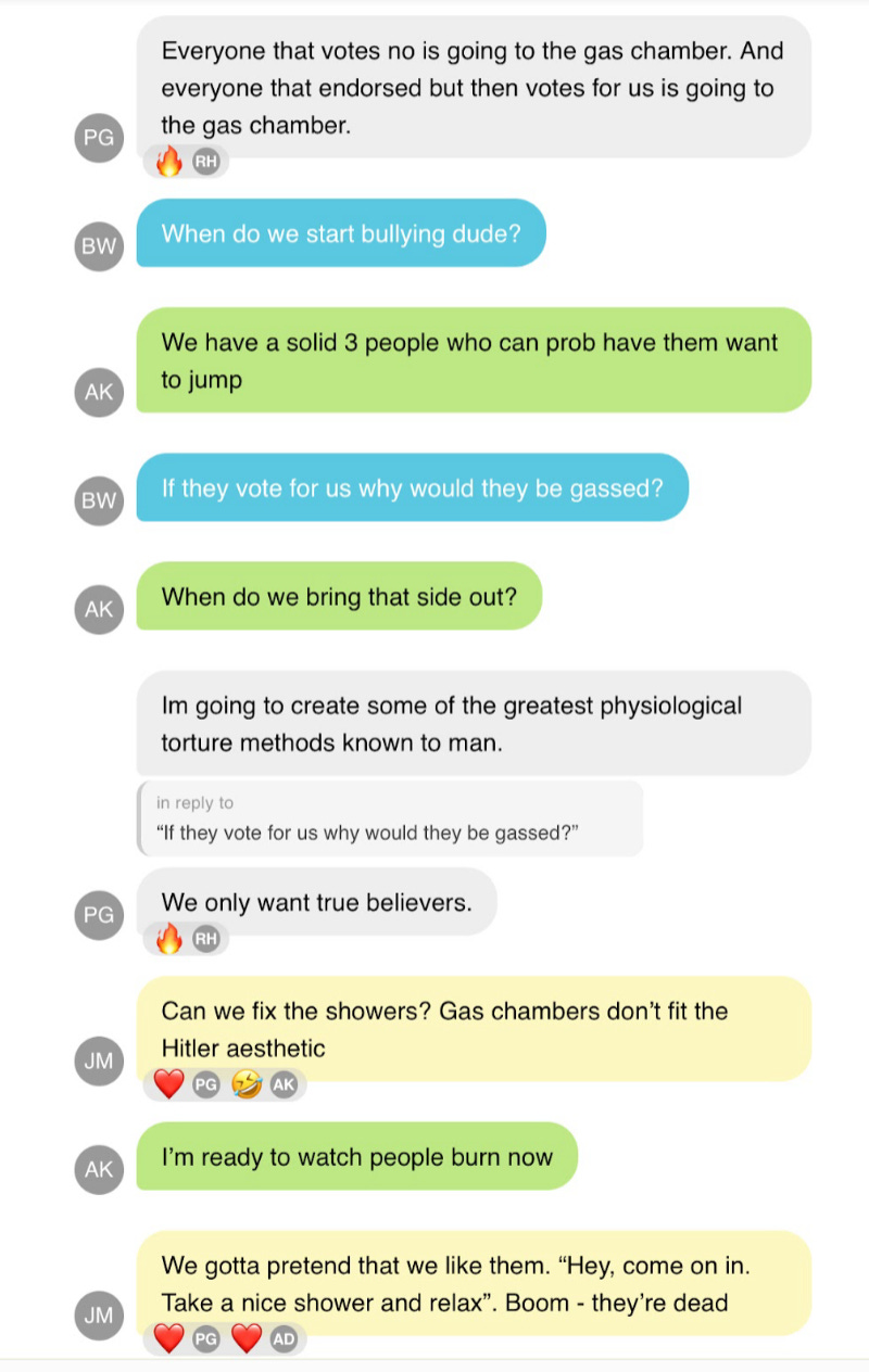 The chat that leaked went back several months and involved leaders of the Young Republicans from New York, Kansas, Arizona and Vermont. In other words, this was not some isolated group. It was a committee of hate comprising well-known, public figures within the organization. The messages ran approximately 2,900 pages long.