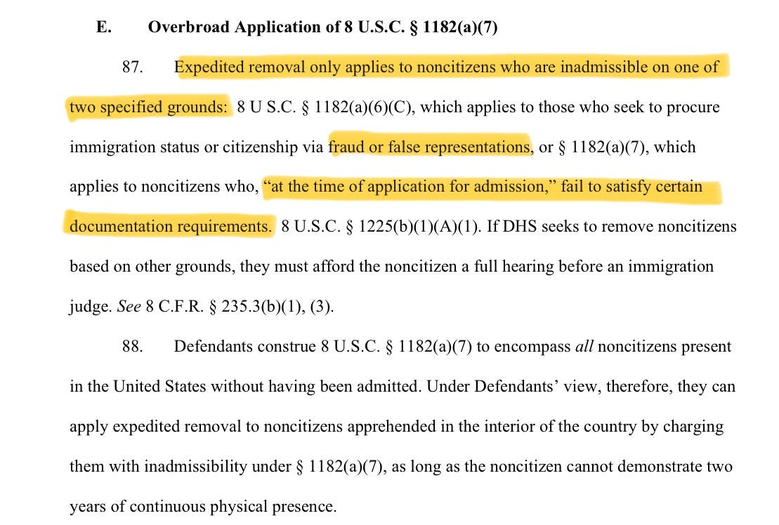 Specifically, in its complaint, filed on behalf of an immigrants’ rights group called Make the Road New York, the ACLU notes that expedited removal without a hearing only applies to noncitizens who are inadmissible on one of two specified grounds: 1) those who sought to procure their status through fraud or false representations, or 2) those who, at the time of application for admission, failed to satisfy certain documentation requirements.
