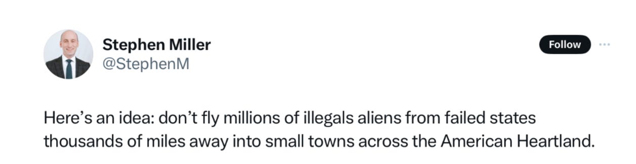 Stephen Miller, who is Deputy Chief of Staff for Policy and Homeland Security Advisor to Trump, was salivating at the prospect. Back in September, he’d taken aim at Biden’s program, posting on social media, “Here’s an idea: Don’t fly millions of illegals [sic] aliens from failed states thousands of miles away into small towns across the American Heartland.”