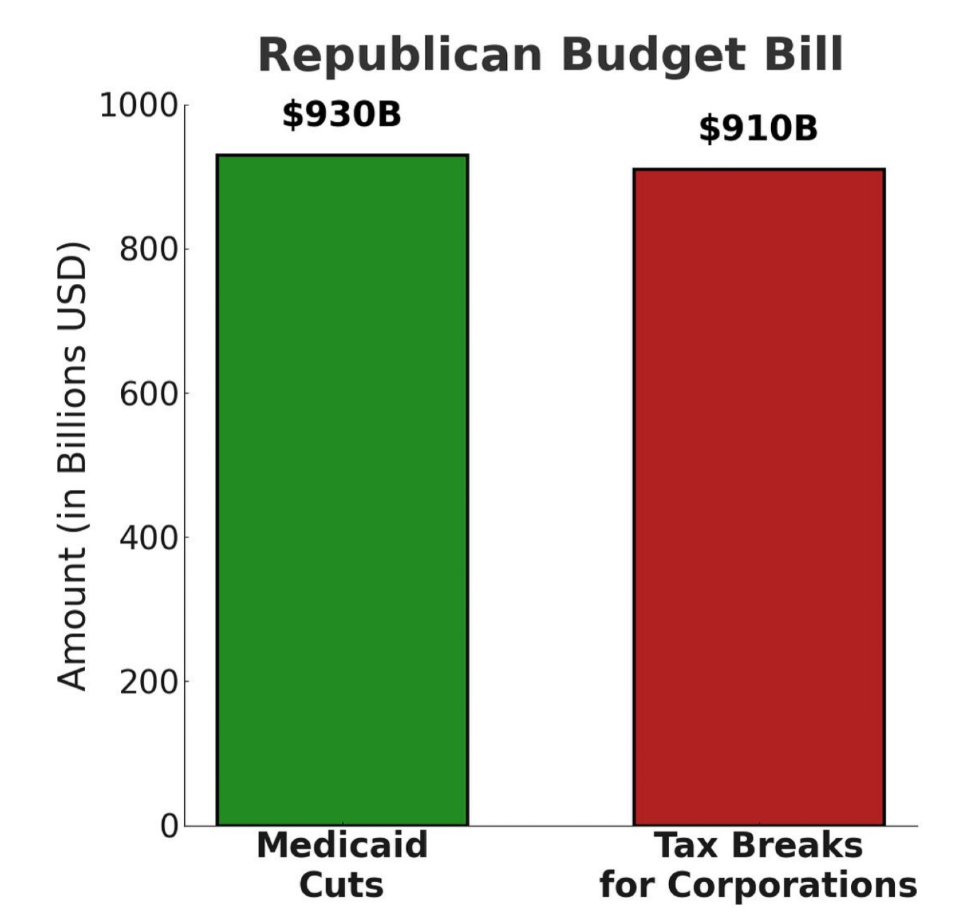 A simple chart put out by Sen. Ron Wyden (D-OR) demonstrates this perfectly and simply, putting side-by-side the cuts in Medicaid to the tax breaks for corporations: