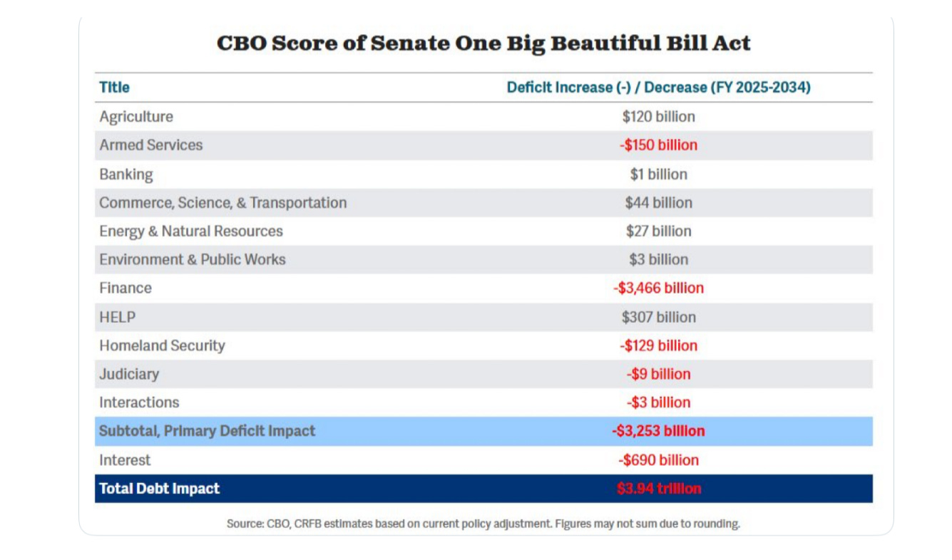 You can see exactly where the bill blows up the national debt in the line items calculated by the CBO. Below is a chart created by the Committee for a Responsible Federal Budget (CRFB) using the CBO’s own numbers. Look for the line for “Finance Committee”—where taxation happens—and you’ll see a huge negative number in red. That’s $3.466 trillion, plus $690 billion in interest (second line from the bottom) if extended, piling a huge new $3.94 trillion onto our national debt: