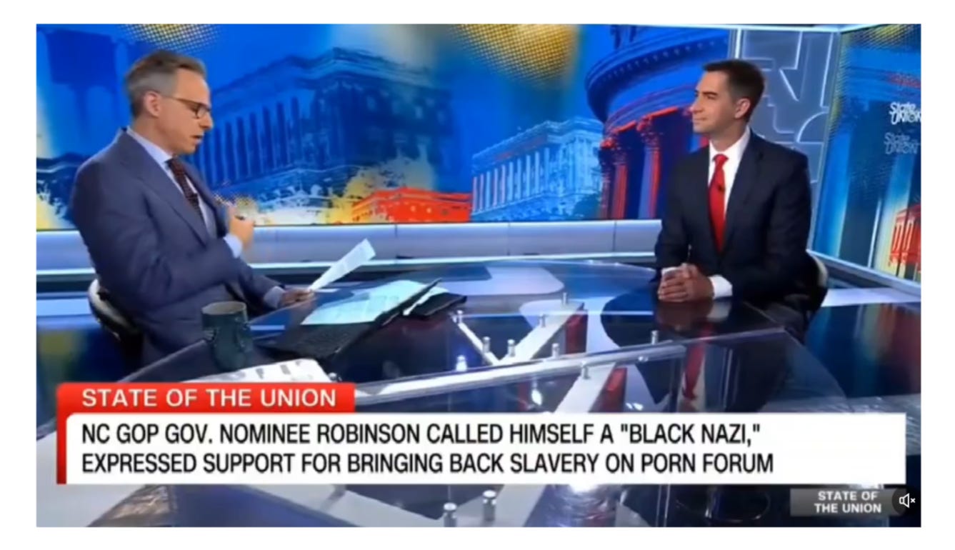 Over the weekend, there were some awkward interview moments as GOP politicians responded to reporters’ questions about Robinson. Sen. Tom Cotton of Arkansas dodged direct questions, telling CNN’s Jake Tapper only that the allegations were “concerning” and that Robinson owes the people of North Carolina “more answers.”