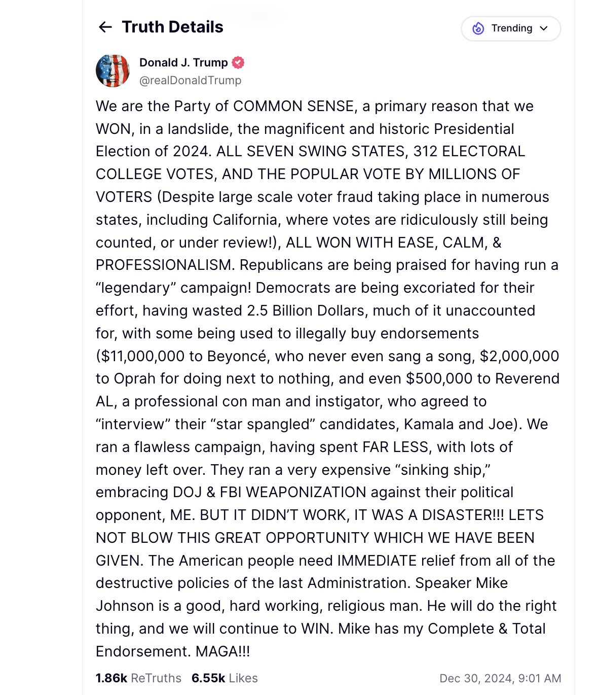 That realization may be why Trump finally came around to fully endorsing Johnson in a social media post last night despite his earlier scathing criticism. We can skip past the pathetic self congratulations and his lies about the Democrats and focus on his last few sentences, which are all that really matter: