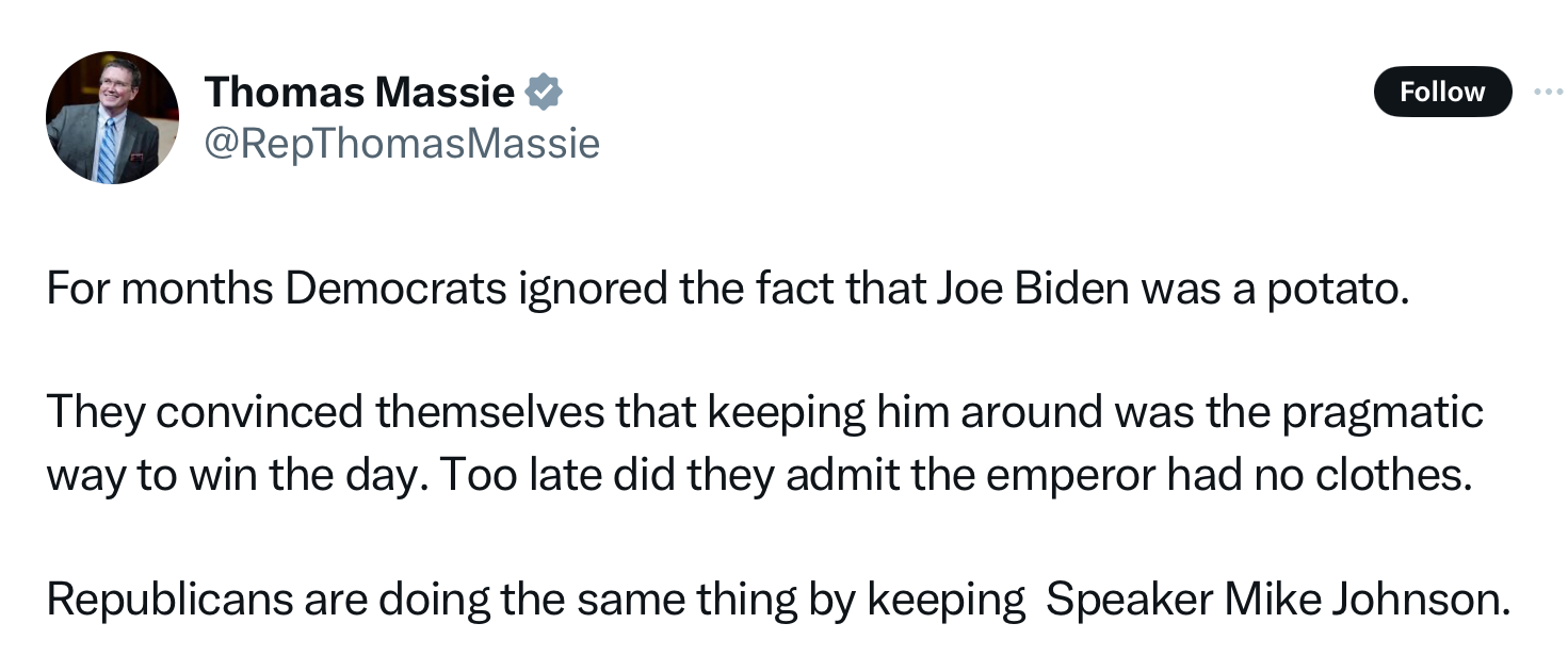 The fact that Johnson needs 218 votes, not 217, winds up mattering here. That’s because Rep. Thomas Massie (R-KY) has already said he will vote “present” instead of “yes.” Since making his announcement, Massie has continued to be openly critical of Johnson’s leadership.