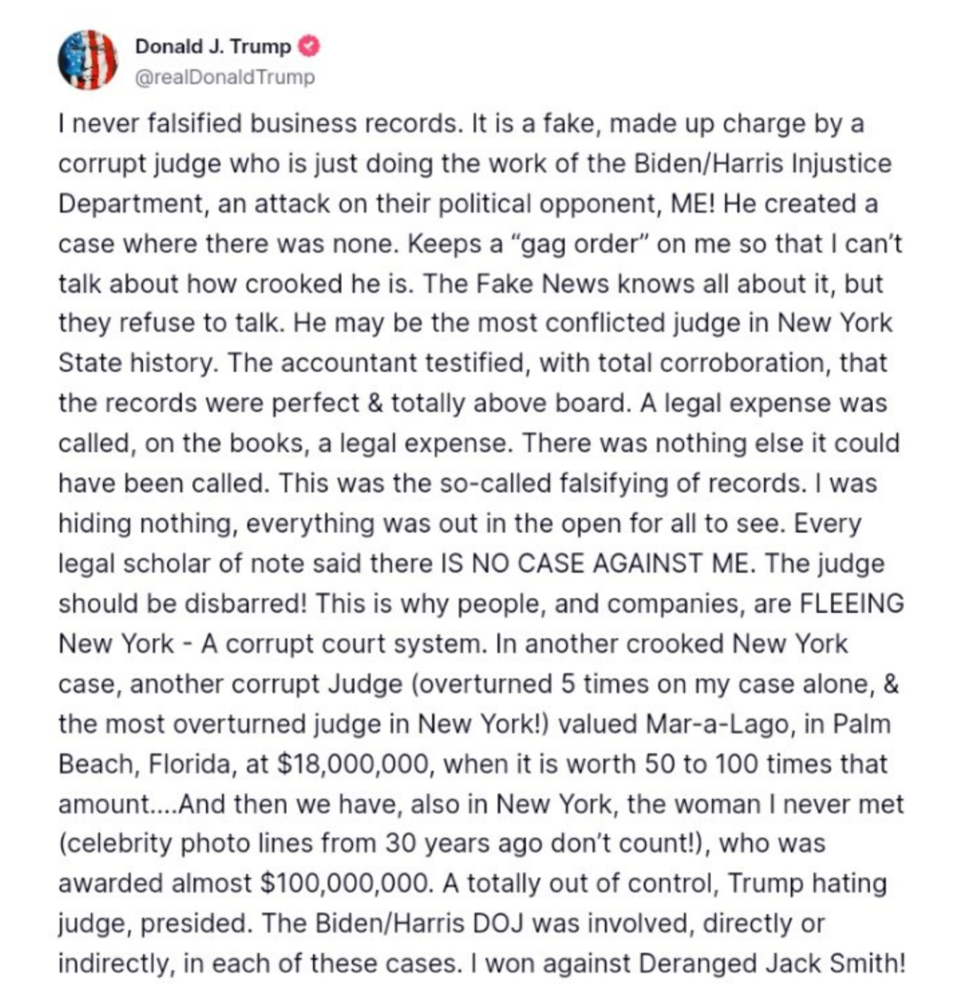 Just take a look at his most recent post about Judge Merchan and the case against Trump in Manhattan, in which he once again railed against the gag order and even called for the judge to be disbarred. I believe the official term for this is a “meltdown.”