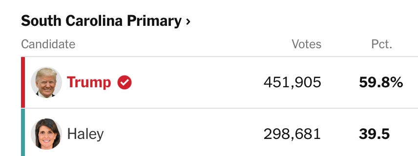 A quick check-in on the state of affairs on the other side of the campaign aisle. For some time now, it’s been down to two people, Trump and Haley, and yesterday the GOP primary contest was in Haley’s home state of South Carolina.