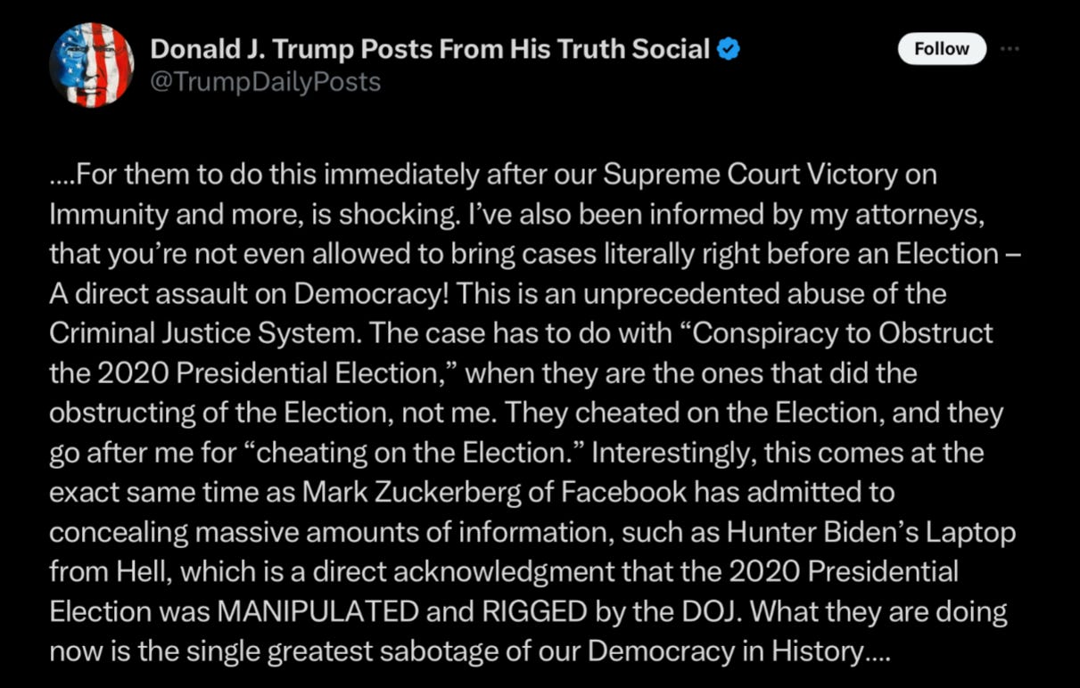 So what is a superseding indictment? If you were to believe Donald Trump, which you should never, ever do, it’s some kind of illegal maneuver to interfere with the election. Following the news of the superseding indictment, Trump posted, “For them to do this immediately after our Supreme Court Victory on Immunity and more, is shocking.”