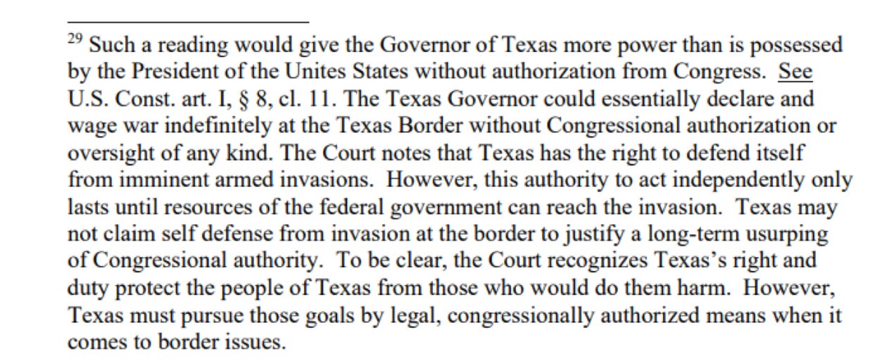 Other legal scholars agreed. As University of Texas law professor Steve Vladeck put it, “By this logic, states could use their own determination that an ‘invasion’ exists as a justification for usurping control of whichever federal policies they don't like. Whatever you think about current immigration policy, this is just a 21st-century re-packaging of nullification.”