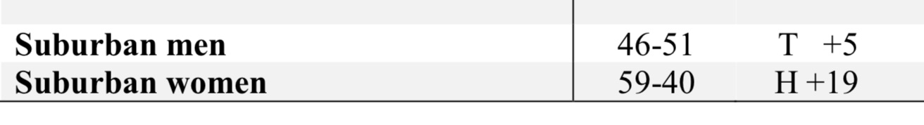 The gap between the genders appears to be driven primarily by a surge in support for Harris among suburban women. As readers here know, I prefer to look at movements within polls over time, rather than point to any absolute numbers, to gauge any significant trends. And we see it with this group. For example, a recent ABC/Ipsos poll has Harris with a 19 percentage point lead among suburban women—a very big number—that importantly is up 10 points from earlier.