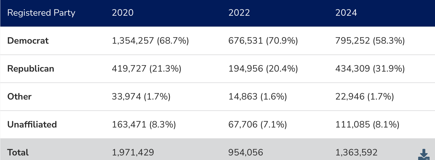 Republicans have been cheering the fact that their early vote numbers in the Tar Heel State now exceed those of the Democrats. Isn’t this a sign Harris is in trouble? Here is how Republicans have surged ahead in just four years to actually outnumber Democrats in early voting: