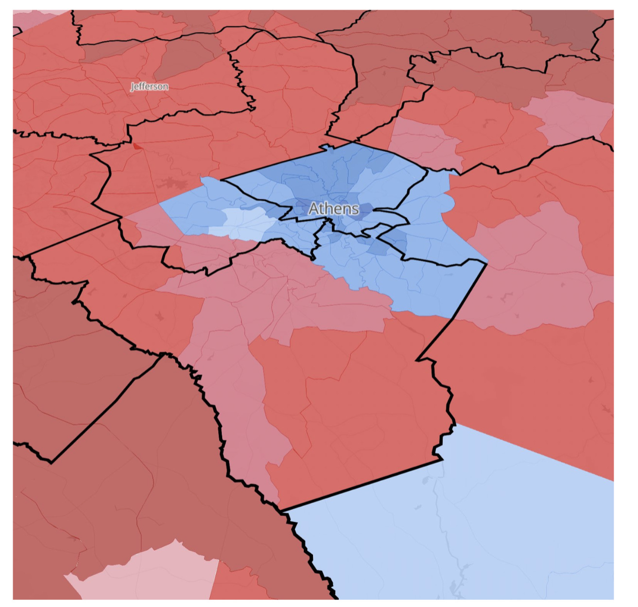 The rest of Athens is similarly, and unfairly, gerrymandered. Here’s a map showing how two other districts have carved up the Athens populace on the western and eastern sides of the city and attached them to heavily GOP counties, while one district has “packed” voters in the center of Athens into a very blue district sink to waste Democratic votes.