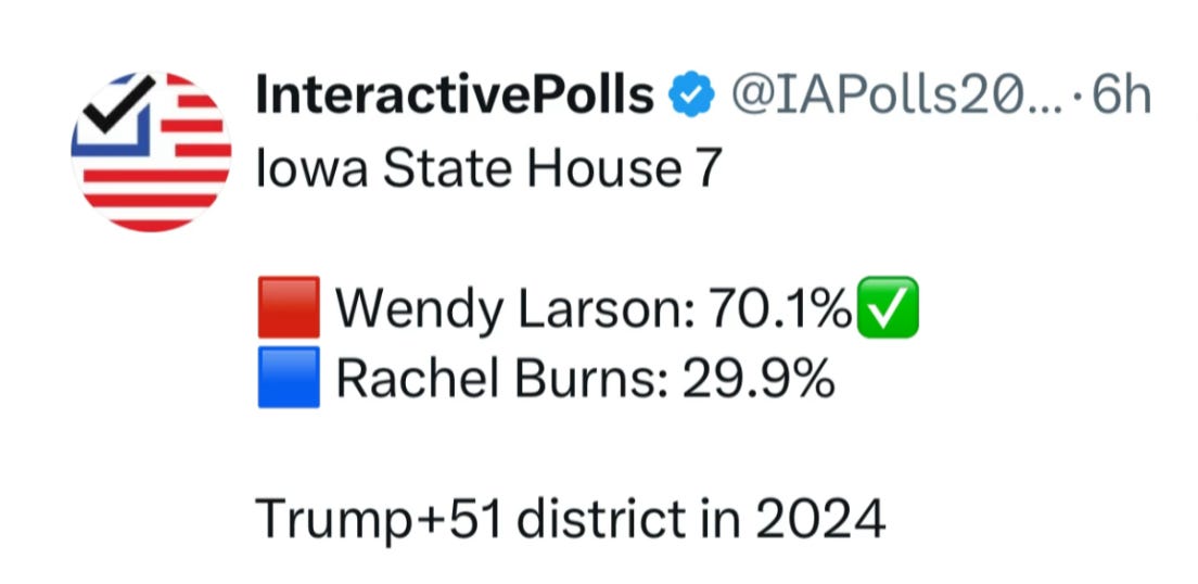 In Iowa, there was a state House contest almost no one paid attention to because the district is so very red. In fact, in 2024 Trump won the district by 51 points.