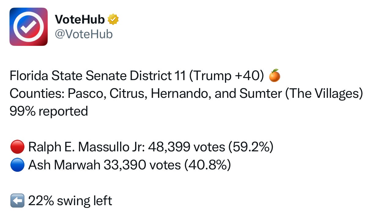 Elsewhere in Florida, Democrats dramatically shifted two state House seat races. In the heavily GOP Villages in SD-11, Republicans held that state Senate seat, but not before the spread shifted blue by a whopping 22 points.