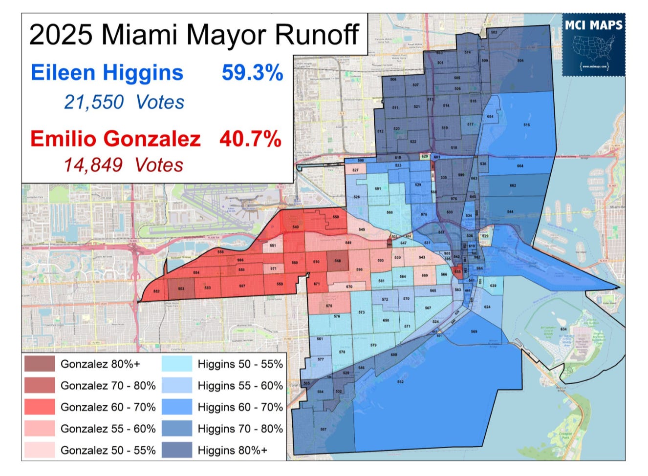 Notably, Higgins dominated everywhere in Miami except the far west part of the city with the highest Cuban population.